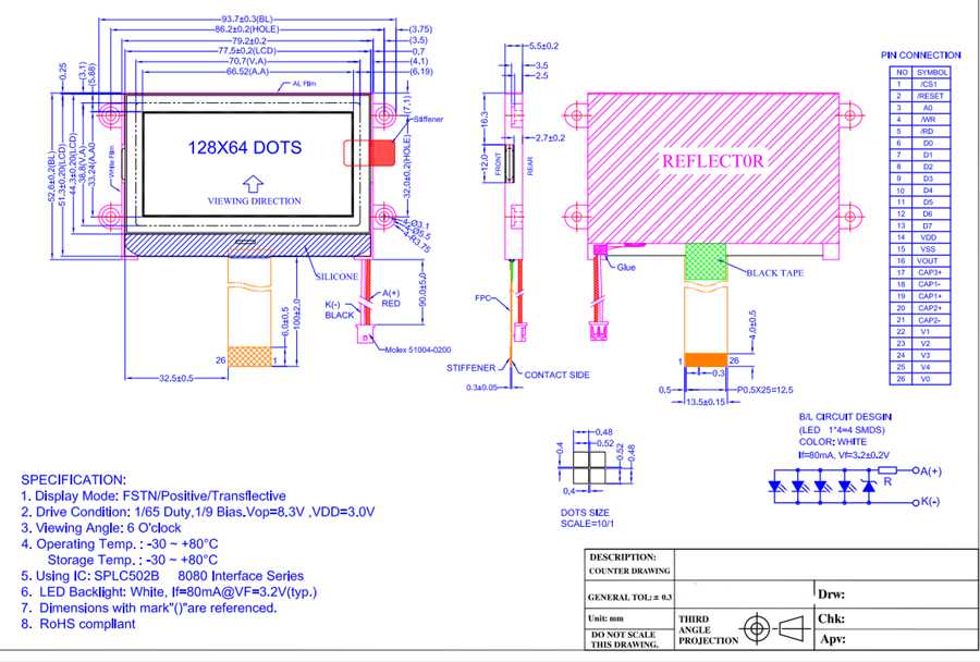 Dot pitch: 0.52mm(L)*0.52mm(W)