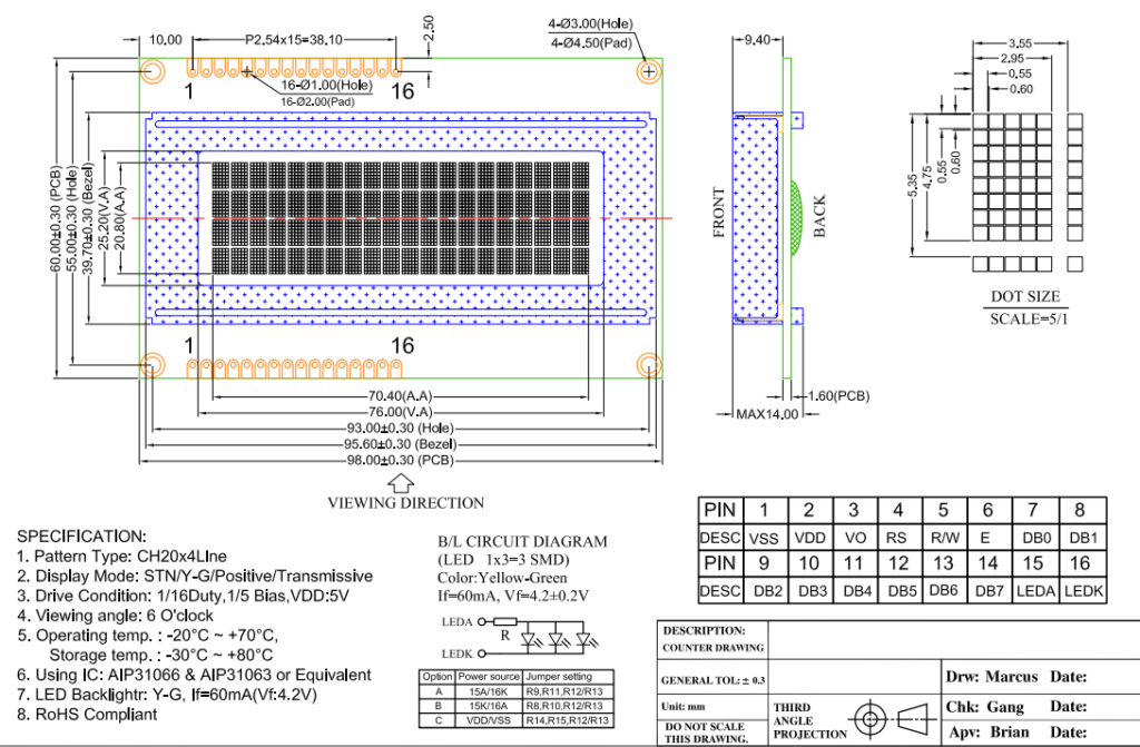 Driving Method: 1/16 Duty, 1/5 Bias, VDD:5V