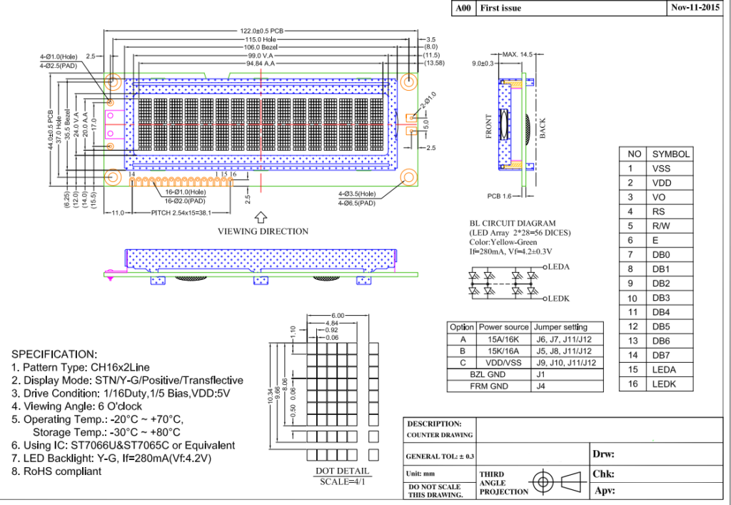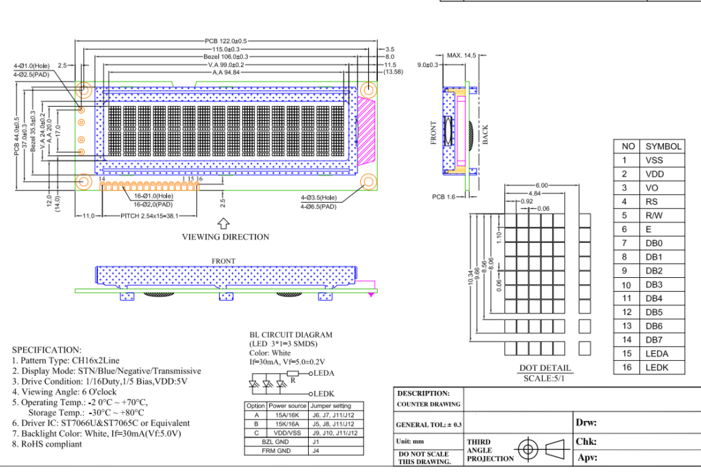 Driving Method: 1/16 Duty; 1/5 Bias VDD:5V